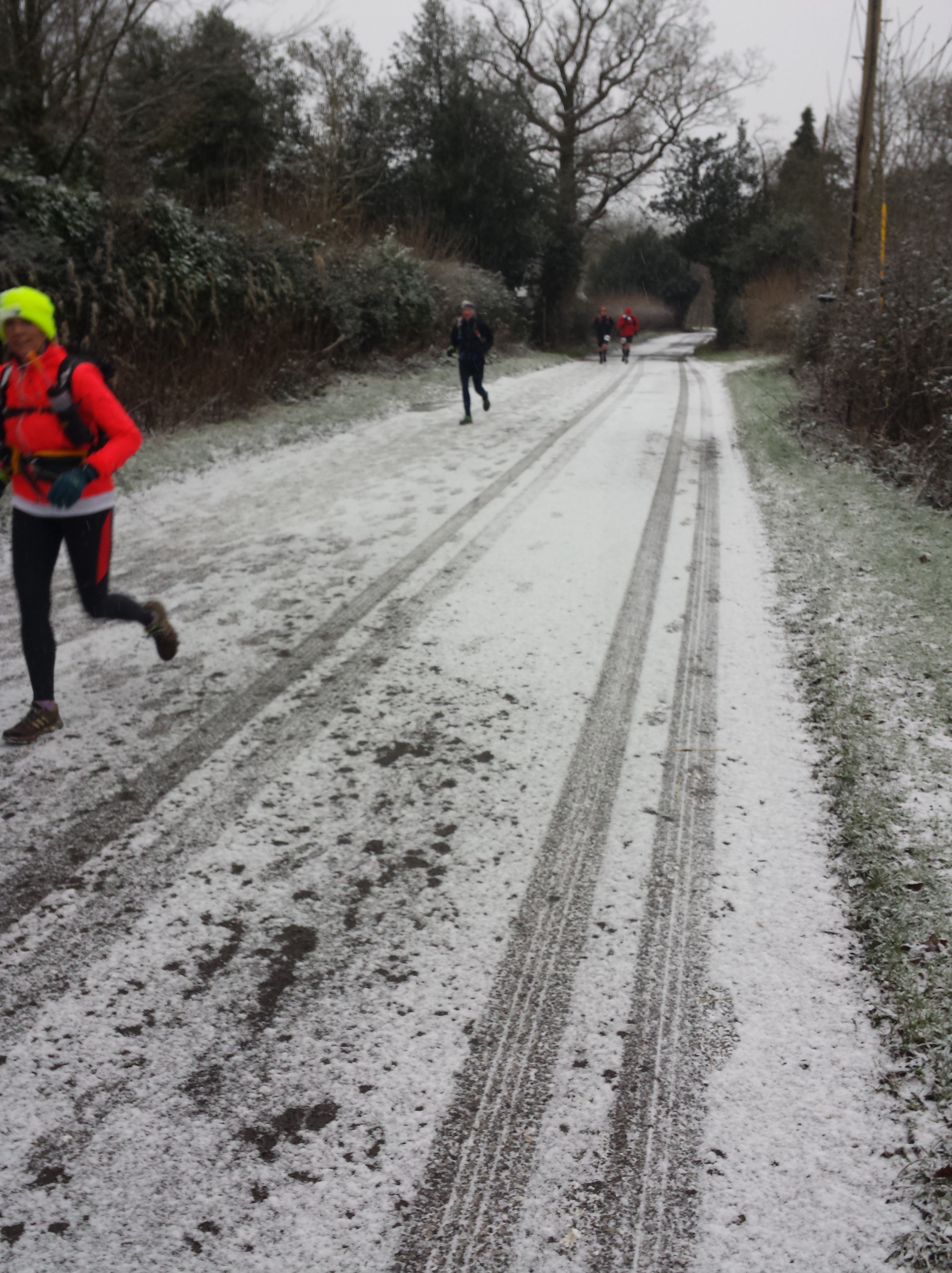 Just after this playing field there was a small stream, with a set of about 10 round stepping stones across the middle. There was a slow chain of runners gingerly picking their way across these slightly-frozen slippery rocks, and occasionally slipping in. Always keen to test how good my waterproof socks are, I sploshed through the water, which was surprisingly refreshing, and I must have gained at least 5 places. Naturally, all those people (with dry feet) caught me up straight away, but I was happy as I dripped my way along the path.