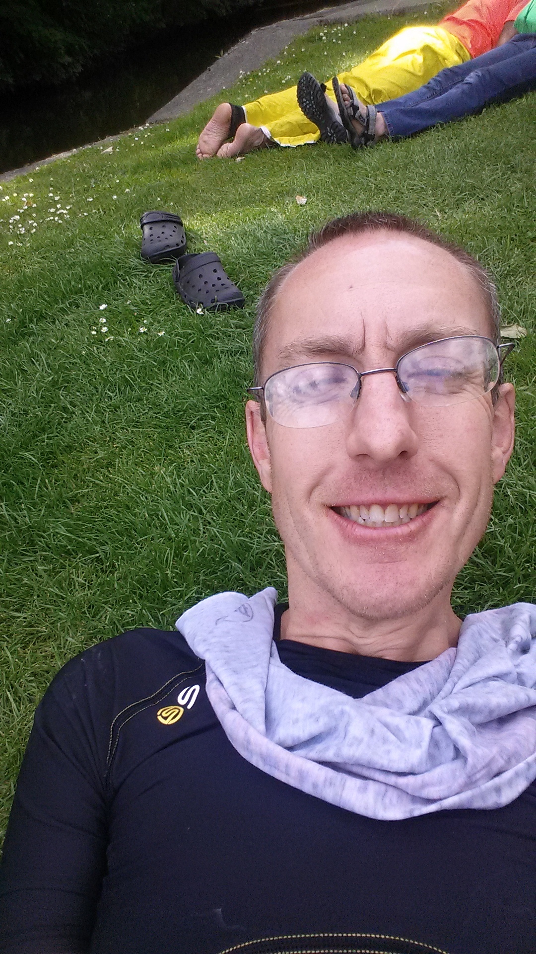 I got to the checkpoint 3 at Yiewsley at about 8am I think. There was a nice grass verge that looking just right for a snooze, and I was planning on sleeping here for about 90 minutes, and then eating. The sun was up and I felt that with a good sleep, my stomach could deal with the water sloshing around in it, and then I’d awake ravenous and ready to eat enough calories for a day’s running. Good!