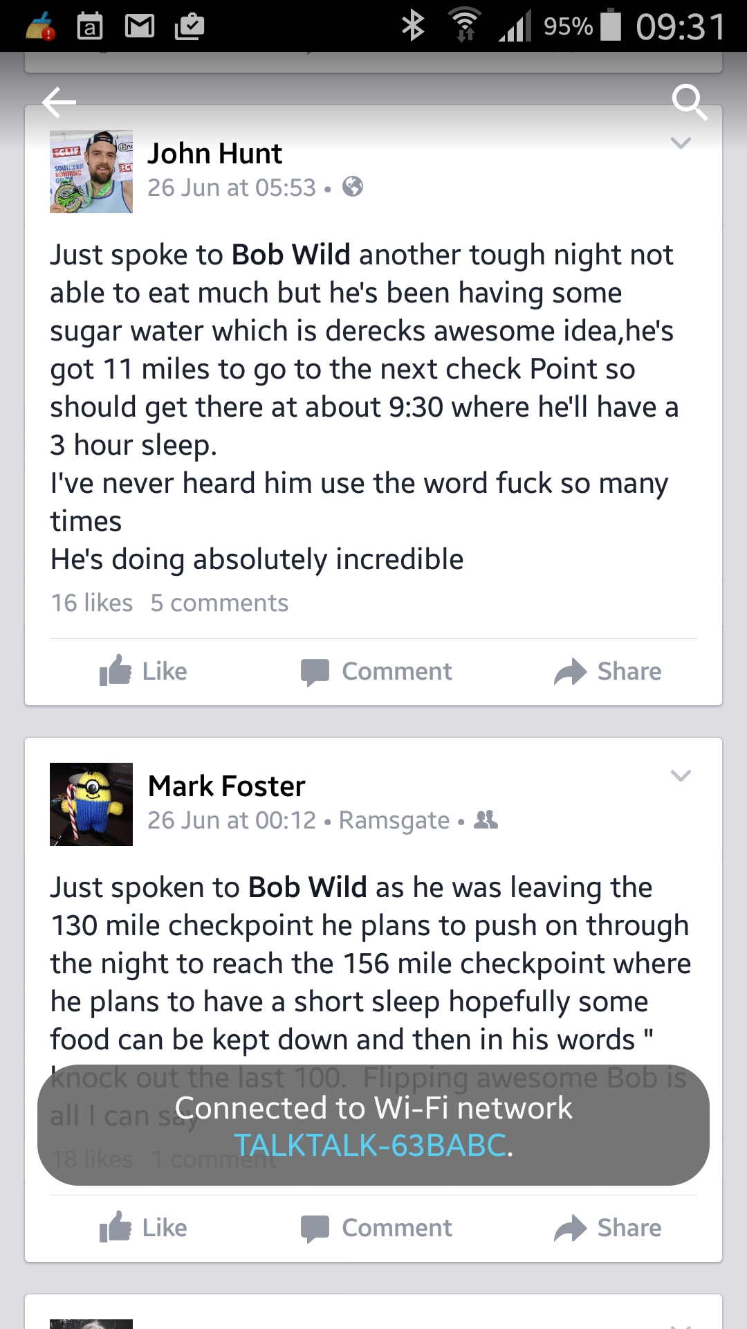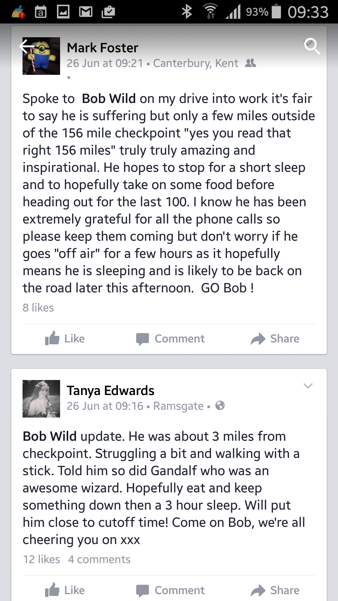 Rich, Javed and Ernie made good progress as they started, and regular Facebook updates and a brilliant satellite tracker meant you could see where they all were on the route at any time. They didn’t stay together, which initially I found strange, but as they told me later, it would be just too difficult to sync up their run & sleep patterns. So they are all out there, separated by a few miles, with a few people meeting them at checkpoints to feed & water them. Other than watching their progress, I didn’t worry too much about them, simply assuming they would all get to the end of the first lap as with their experience they would not have volunteered for something that wasn’t achievable, would they?