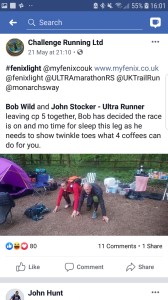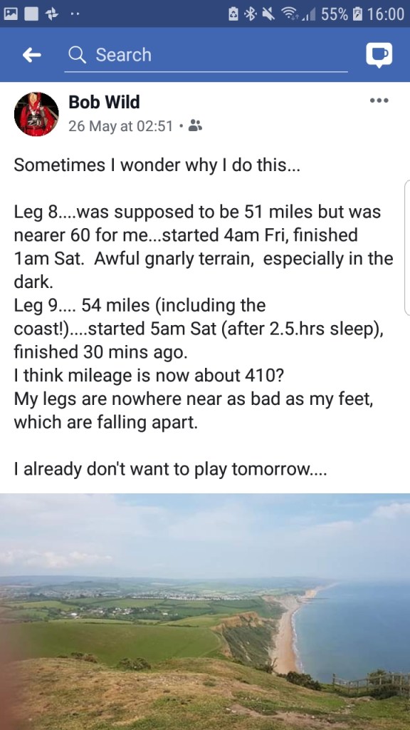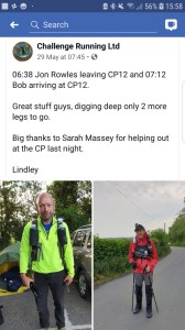 Thanks to my “Bob’s running problems” group of experienced ultra runners, who helped me far more than I would ever have believed. To go to sleep, having posed a problem, and then wake up to loads of ideas and suggestions was great, and it really felt like you were out there with me. So, in no particular order….Jo Barrett, Ben Davies, Dave Falkner, Paul Pickford, John Hunt, Mark Foster….you’re all super-stars.