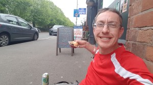 I was sitting in a beer garden (with my shoes off naturally) as the weather was quite warm, surrounded by groups having evening drinks and generally enjoying themselves. I was a little out of place. Suddenly there was a bloke in running kit in front of me, and one of the guys from my ‘running problems’ group, Paul Pickford, had turned up to see me. It was, as always, great to see a friendly face, and gave me a massive lift. After a brief chat, he ran off (very quickly!) and I plodded on, grinning. I had spent the majority of the previous 9 days on my own, apart from brief stops at the checkpoints. The strangers I encountered were all really pleasant (unlike some of Ellens nutters, but that’s another story) but they were still strangers, who didn’t know me or what I was doing (or why I looked like I did). That’s why just seeing a friendly face for 20 minutes made a huge difference to the day and my mood.