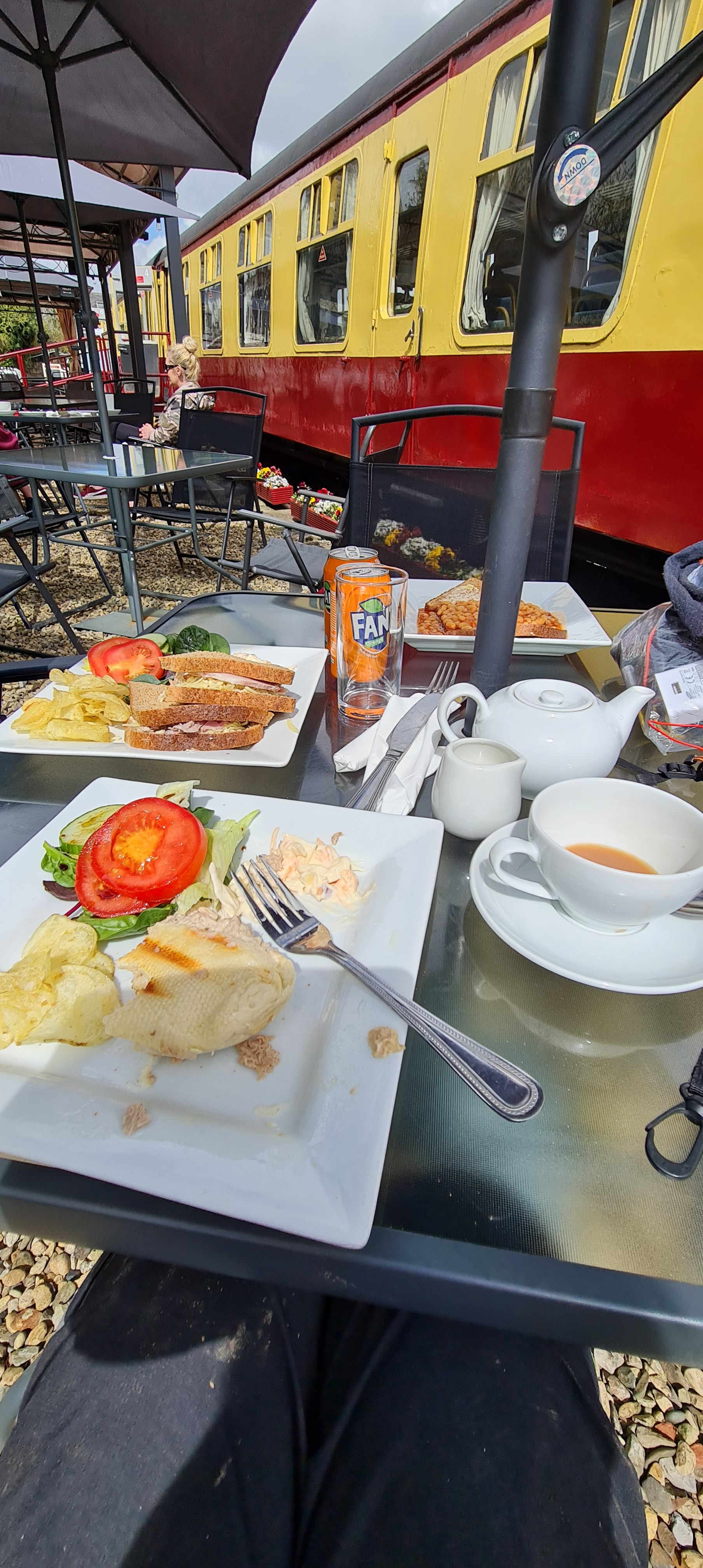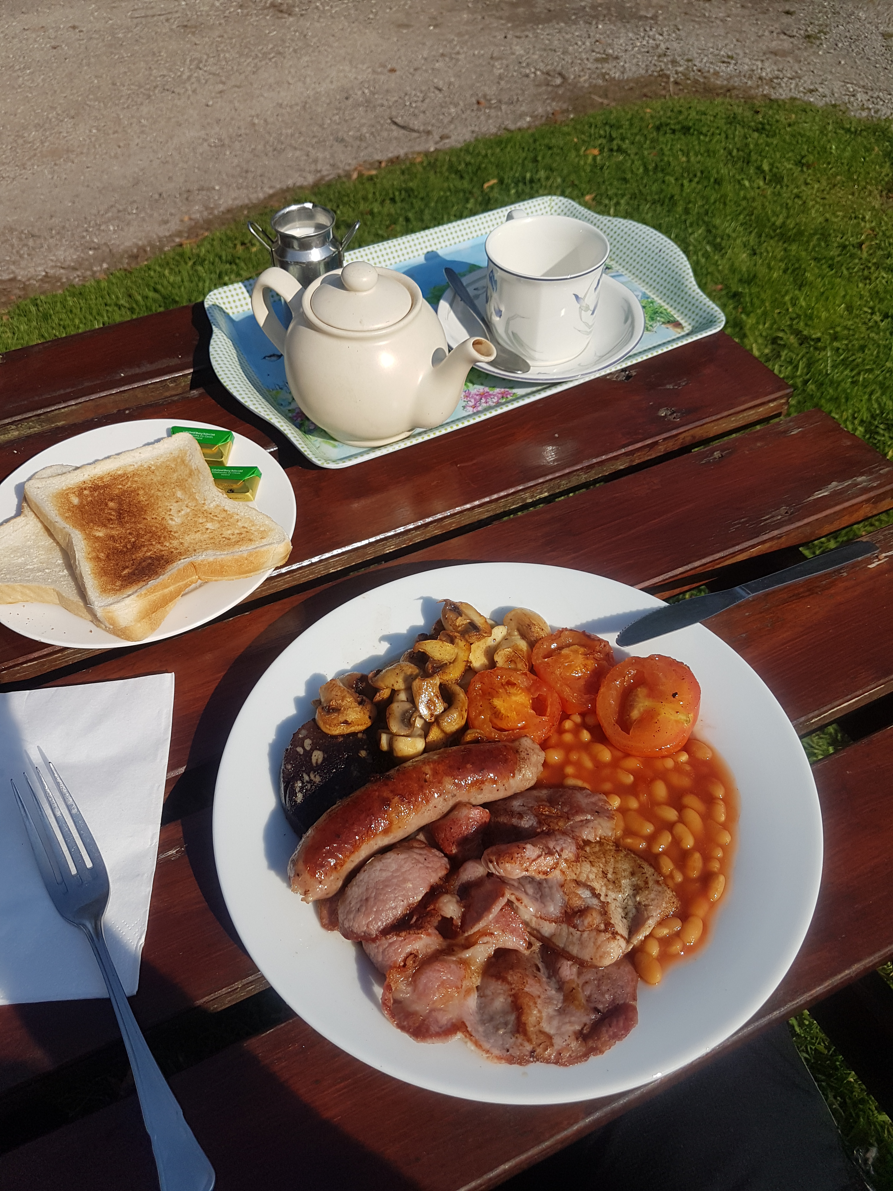As we got to the pub car park, Sharon was waiting on a bridge up ahead, and it was great to see her in daylight. She said that someone from the pub had been cleaning and had come out to see what she was up to, and had switched on the patio heaters for us. So we not only had bacon, coffee, but sat under this tiny heater that did little except look nice. It didn’t matter, we were all in good spirits and fooling about, perhaps a little punch-drunk from coming out of the other side of a rough night.